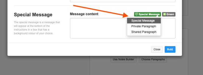 You can also choose to add a special message. The special message is a message that will appear at the bottom of the instructions in a box that has a background colour of your choice. There are a few standard messages which you can select from the dropdown, or type in your own message and choose the colour of the box.