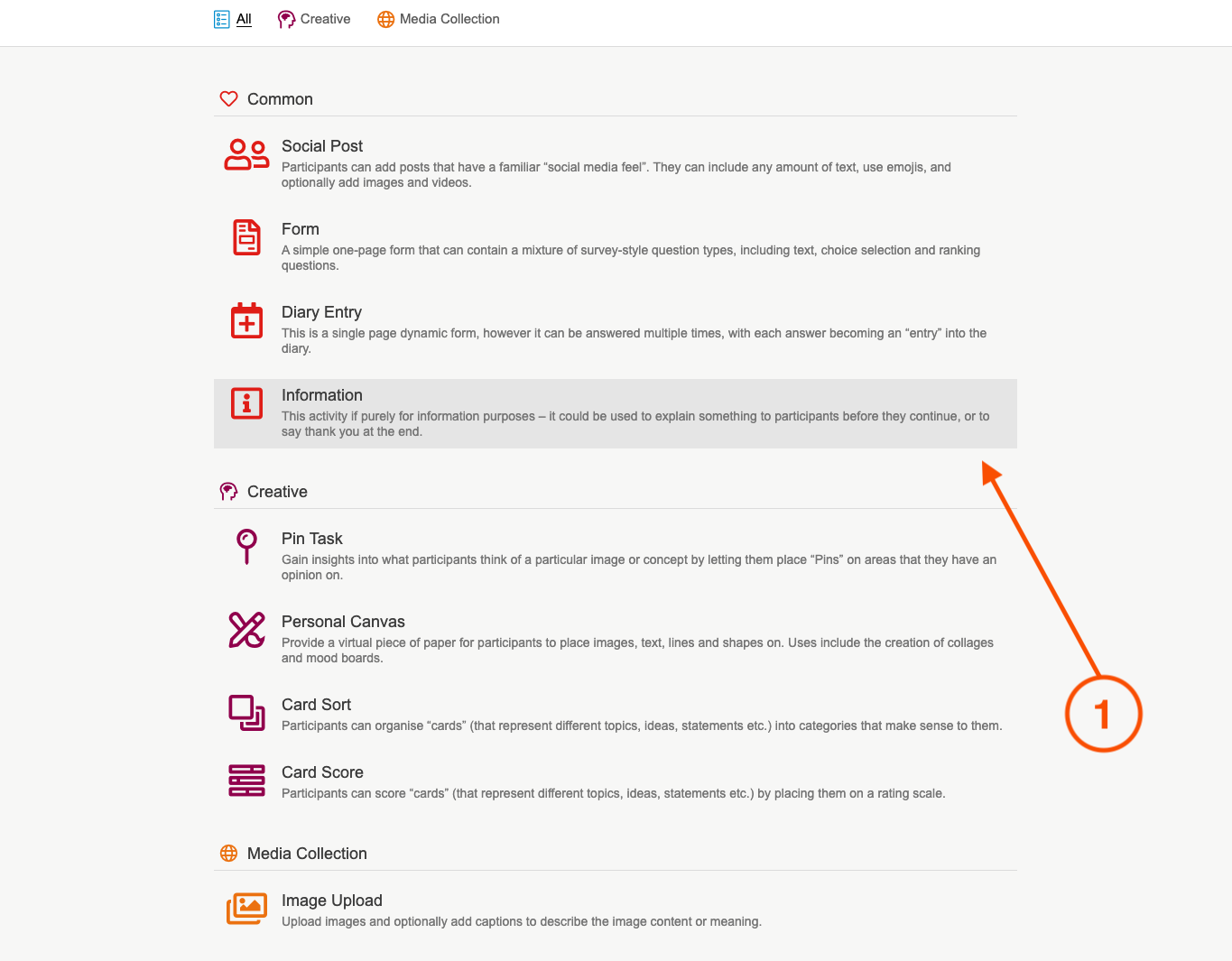 1. Choose the 'Information' activity from the list of activities that appear, after you have clicked add activity in the activity edit page.