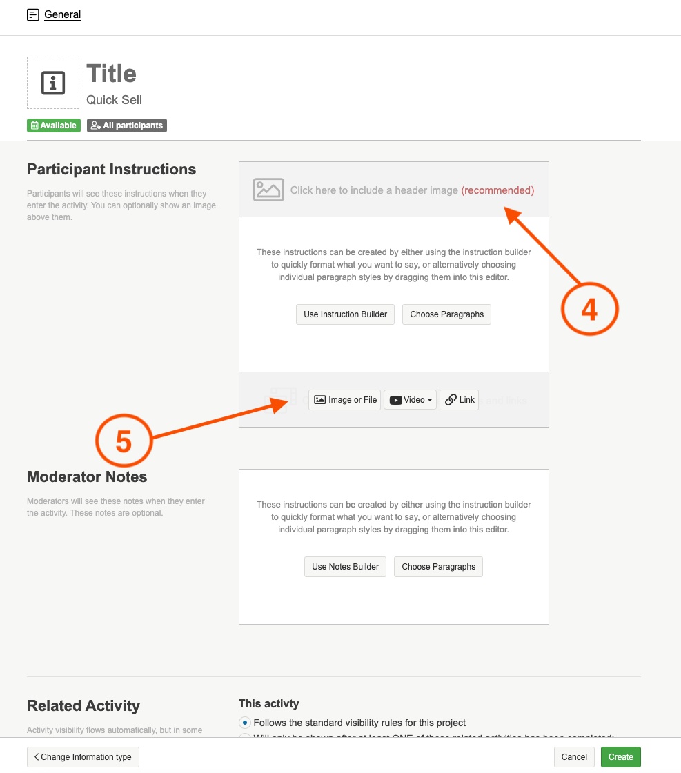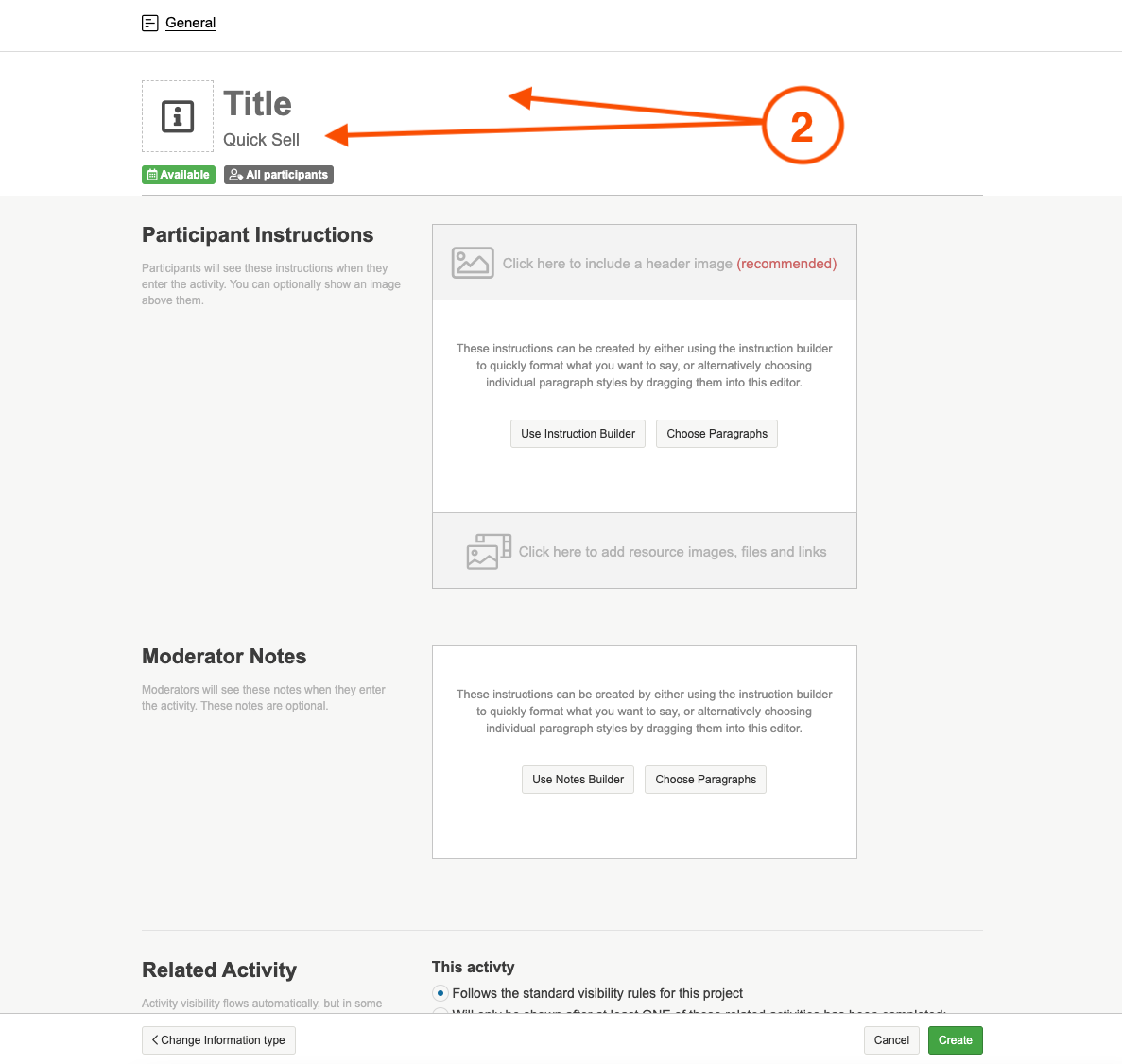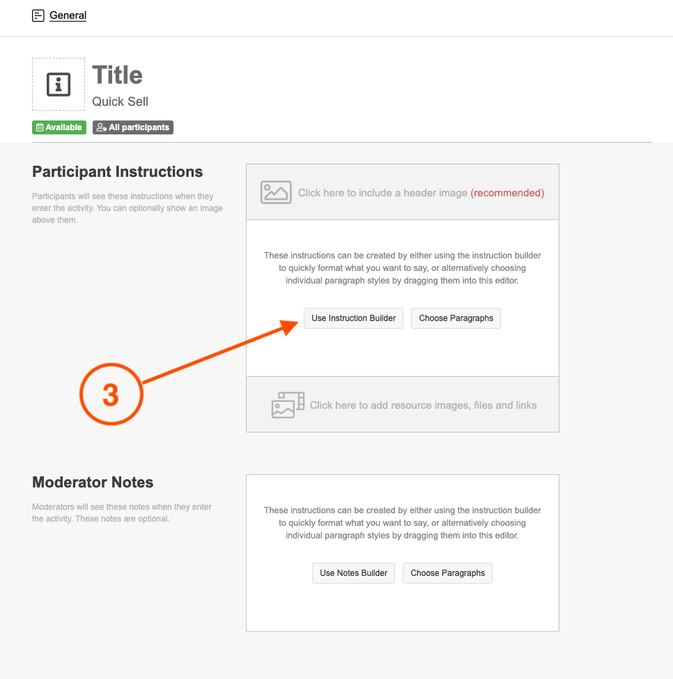 3. In an Information activity, you will need to add ALL of the content into the participant instructions section. We recommend using the instruction builder to add in your content. To begin using the instruction builder you click on the 'use instruction builder' button.