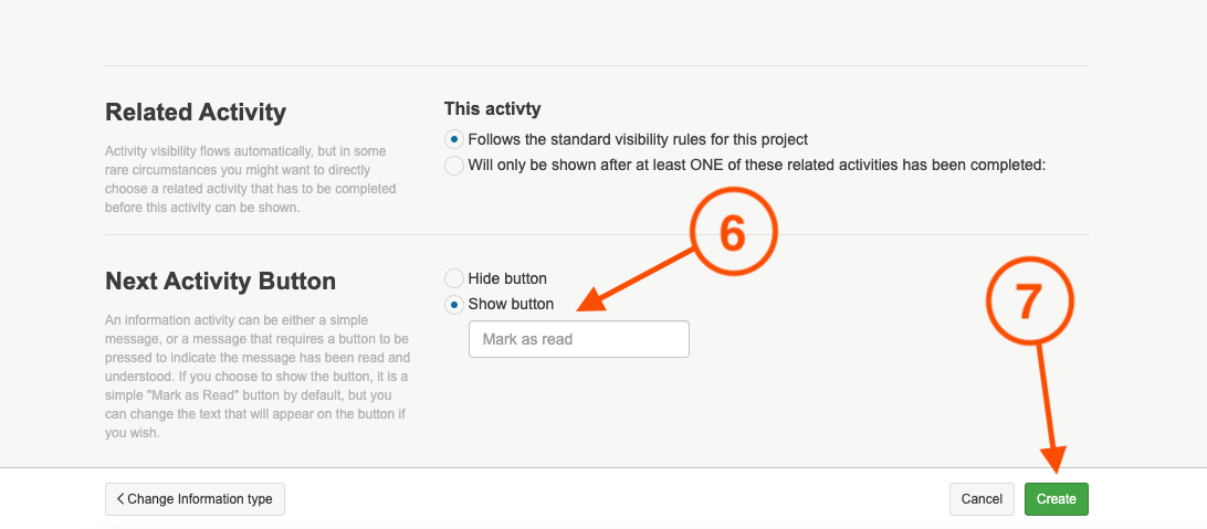 6. An information activity can be either a simple message, or a message that requires a button to be pressed to indicate the message has been read and understood. If you choose to show the button, it is a simple "Mark as Read" button by default, but you can change the text that will appear on the button if you wish in the 'Next Activity Button' section.