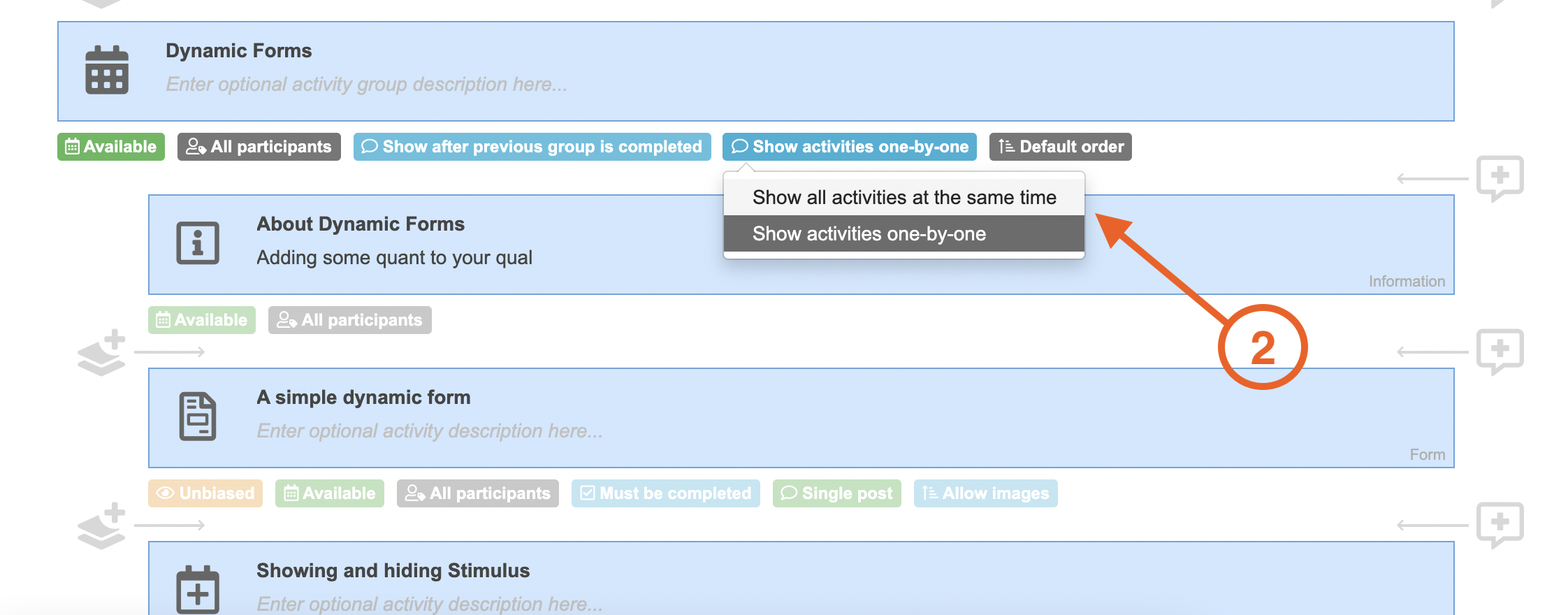 1. Click on the 'show activities one-by-one' setting, along the row of settings underneath the activity group title and description.