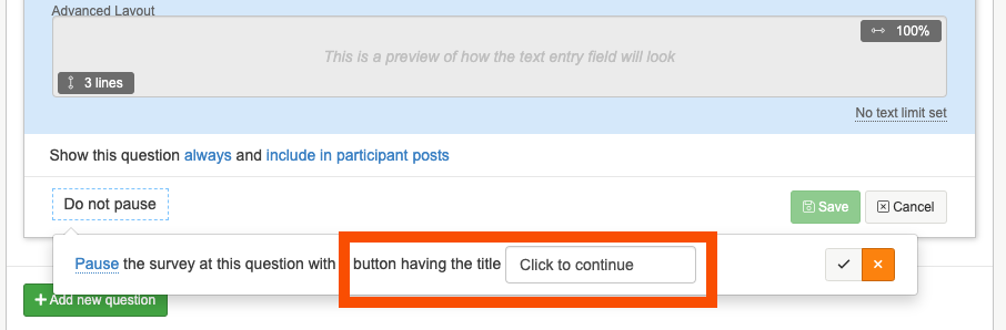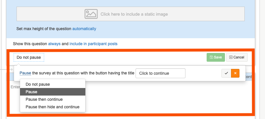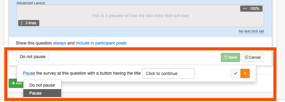 1. At the bottom of the question box you will see a 'Do not pause' button, this is the default setting. To add in a continue button underneath the question click on the button and change it to 'Pause'.