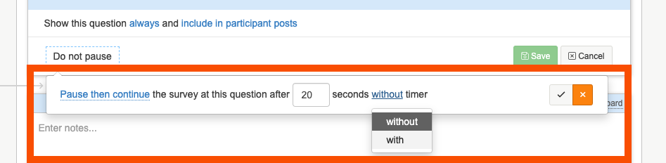 1. Click on the 'Do not pause' button to bring up your options, the bottom two options will show your question on screen for a certain amount of time. The last option will then hide your question after the time is up, this is a good setting to use if you want to show an image or statement on screen, hide it and then ask for your participants initial reaction.