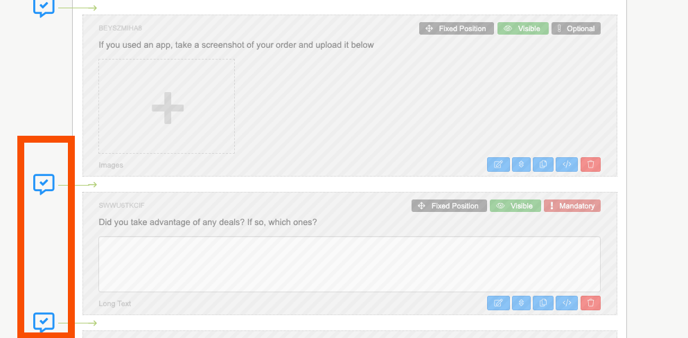2. When you have selected that button, blue ticks will appear down the left hand side. Click on the blue tick to move the question into that position.