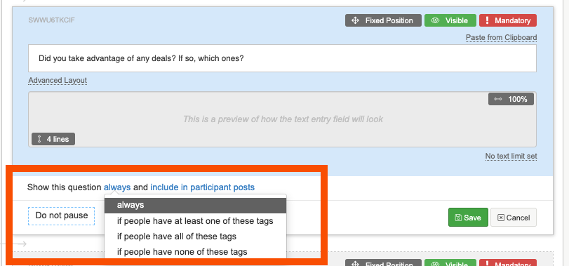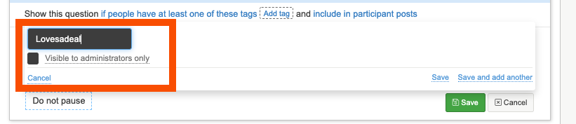 3. Select save to add the tag to the question. N.B you will need to make sure that the participants are tagged with same tag so the question is shown to them